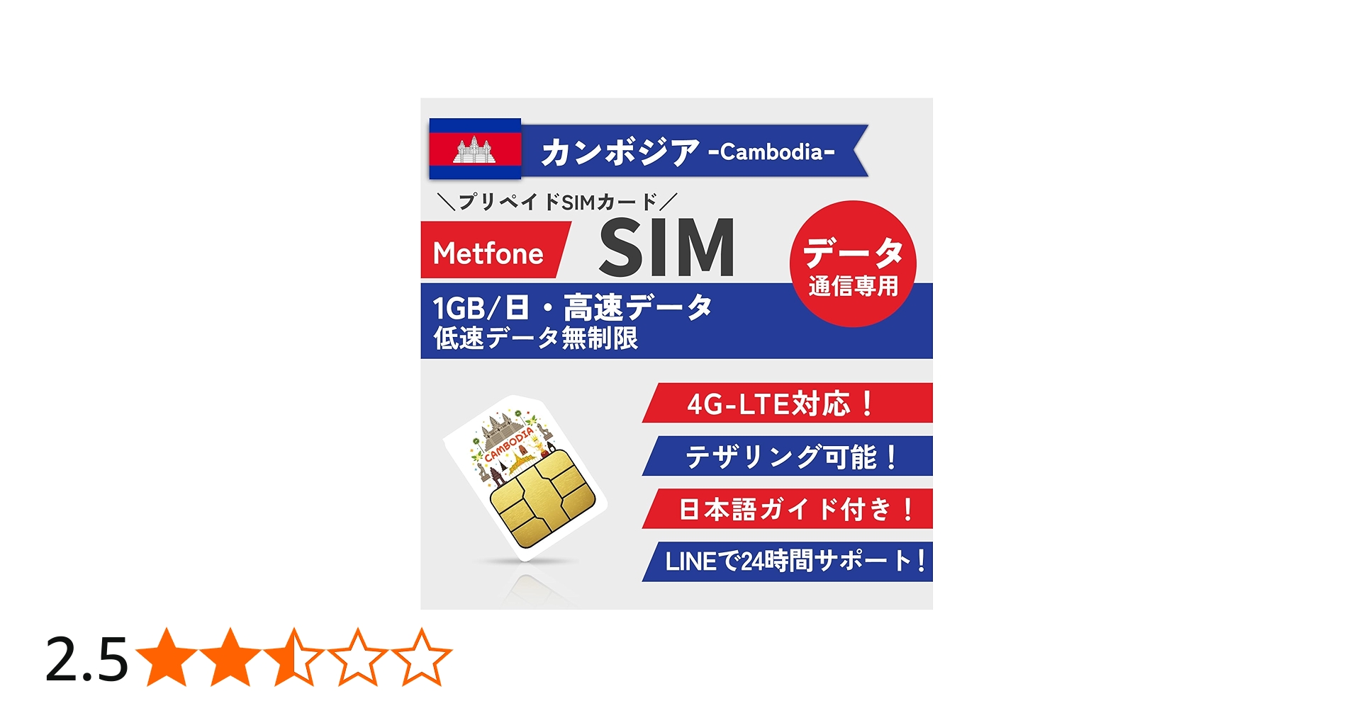 【カンボジア SIM】1GB/日・高速データ通信 低速無制限 4G-LTE対応 データ通信専用(電話番号なし)カンボジア プリペイド SIMカード | 説明書付 年中無休・24時間サポート (【SIM】 5日間)